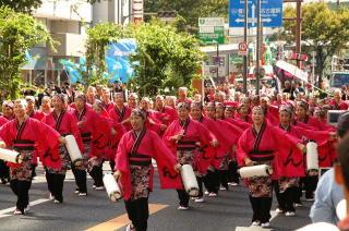 | 鹿児島南端の沖永良部島のよさこいチーム「鳴子DEセリョーサ」と大阪・堺の「なんでやねん」のコラボチームで、よさこい鳴子踊りとエイサーのチャンプルーを表現したいと思います。本場高知よさこい祭を心ゆくまで楽しむぞーっ! |
