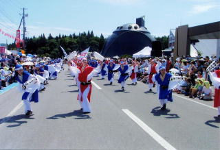 | その昔、土佐から引っ張ってきたという岬が沼津にあります。そこで生まれた「勇み踊り」と「よさこい踊り」をおめでたく♪ちゃんちゃら面白く踊ります。 |